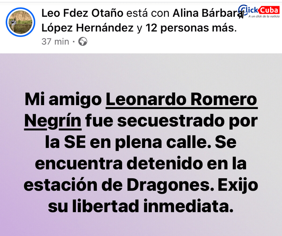 Hoy, Leonardo Romero Negrín ha sido nuevamente detenido por la Seguridad del Estado en plena calle. Según una publicación del activista Leo Fernández Otaño, Romero fue secuestrado y llevado a la estación de Dragones sin explicaciones, lo que ha generado preocupación y llamados a visibilizar su situación para asegurar su seguridad y libertad