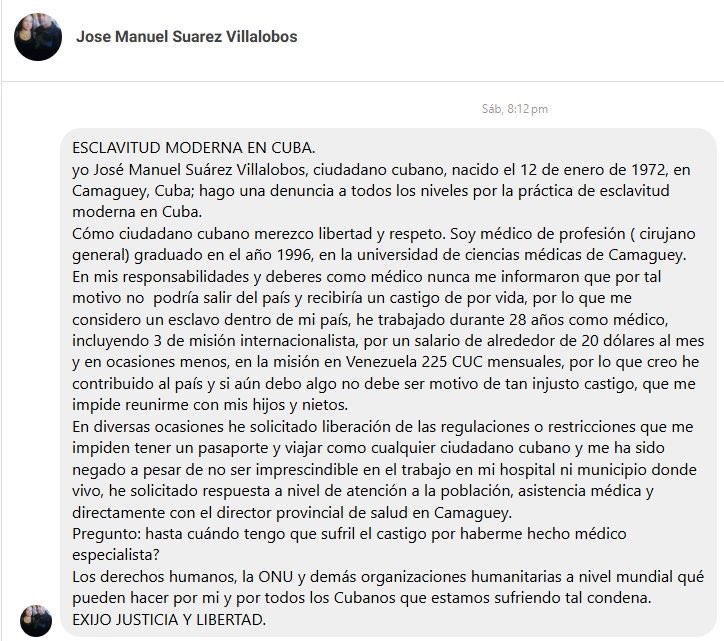 Suárez Villalobos hace un llamado a las organizaciones de derechos humanos, la ONU y otras entidades humanitarias internacionales para que intervengan y pongan fin a lo que él y muchos otros cubanos consideran una forma de esclavitud moderna. «Exijo justicia y libertad», concluye en su denuncia, esperando que su voz resuene más allá de las fronteras de Cuba y genere la atención y acción necesaria para cambiar esta situación.