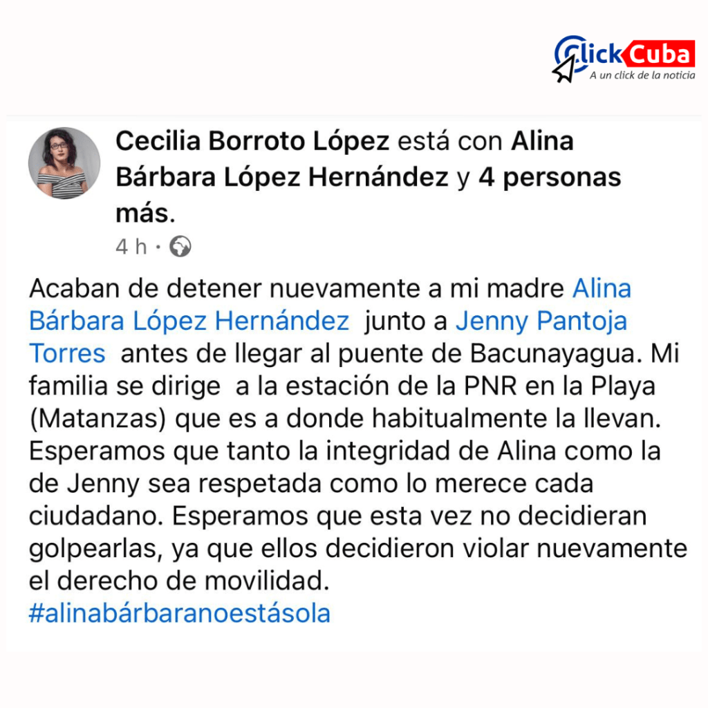 La publicación de Cecilia también expresa una profunda preocupación por la integridad física de Alina y Jenny. En palabras de Cecilia: «Esperamos que tanto la integridad de Alina como la de Jenny sea respetada como lo merece cada ciudadano. Esperamos que esta vez no decidan golpearlas, ya que ellos decidieron violar nuevamente el derecho de movilidad». Esta declaración subraya la reiterada vulneración de derechos que sufren los activistas en Cuba, especialmente el derecho a la movilidad y la seguridad personal.