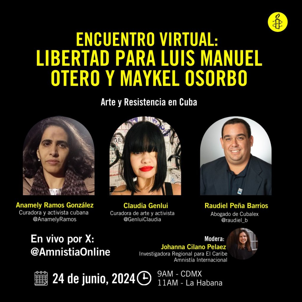 El próximo lunes 24 de junio de 2024, Amnistía Internacional Américas organizará un importante encuentro virtual titulado «Libertad para Luis Manuel Otero y Maykel Osorbo: Arte y Resistencia en Cuba». Este evento será transmitido en vivo a través de la plataforma X, en la cuenta oficial @AmnistiaOnline, y está programado para las 9:00 AM (CDMX) y 11:00 AM (La Habana).