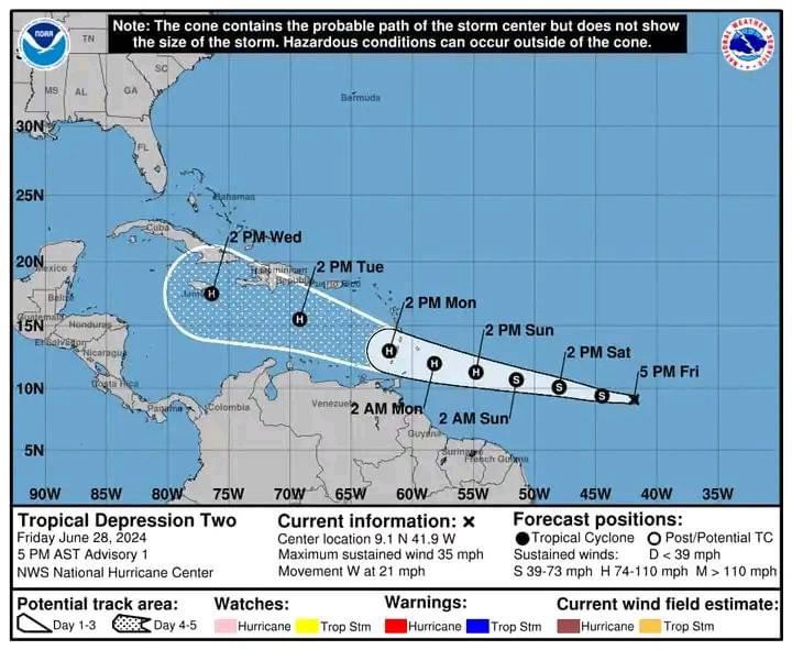 La Depresión Tropical Dos podría convertirse en la primera tormenta tropical y potencialmente en el primer huracán de la temporada. Las comunidades en las Islas de Barlovento y en otras áreas potencialmente afectadas deben prepararse y seguir las recomendaciones de las autoridades locales.