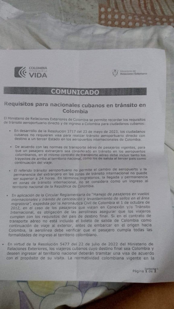 Un reciente comunicado del Ministerio de Relaciones Exteriores de Colombia ha generado confusión entre los ciudadanos cubanos en tránsito hacia terceros países. Este documento, difundido a través de la Embajada de Colombia y accesible en línea, aclara los requisitos de visado para los nacionales cubanos que transitan por Colombia, pero ha dejado a muchos viajeros preocupados por su situación.