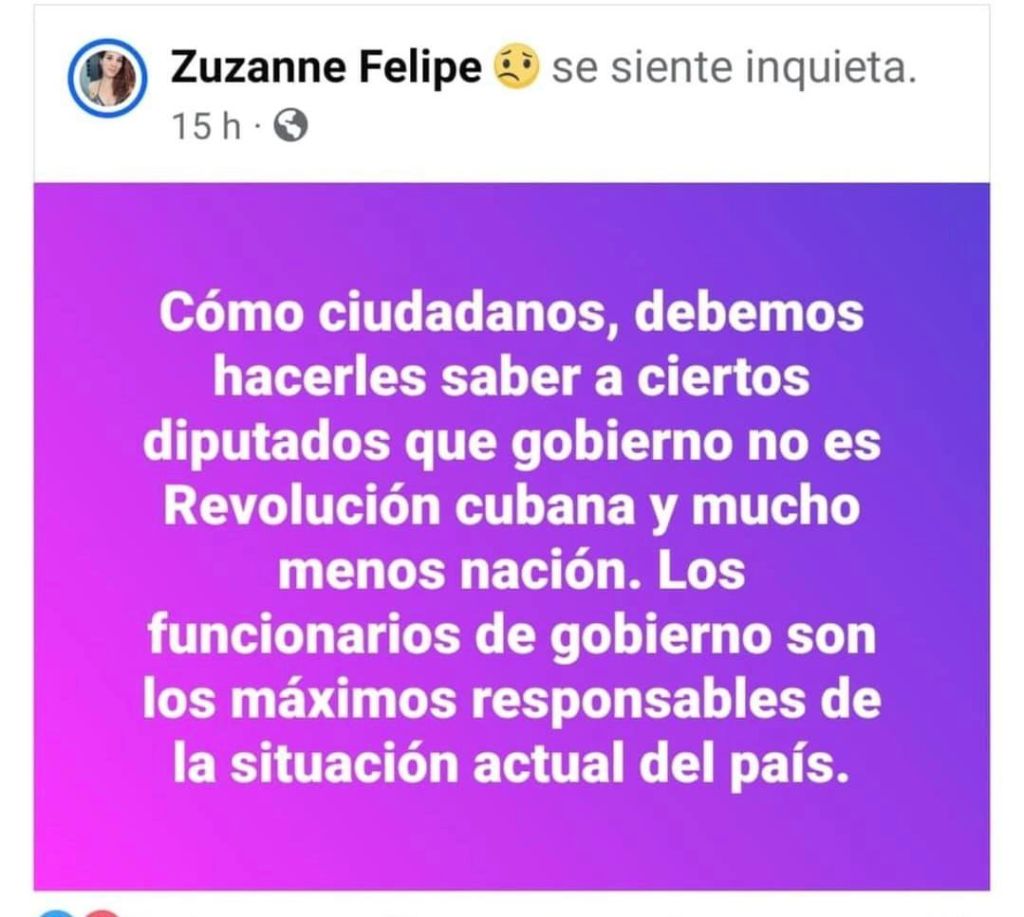 Suzanne Felipe, otra destacada defensora del régimen, también ha expresado su desencanto, provocando un gran revuelo. Este desencanto se conoció gracias a un post de Lara Crofs en Facebook, donde se recopilan las opiniones críticas de Martin y Felipe sobre Díaz-Canel y los dirigentes en general. Ambas activistas se sienten decepcionadas y traicionadas por aquellos en quienes depositaron su confianza durante años. Han trabajado incansablemente para apoyar el proyecto revolucionario, pero ahora sufren la falta de alimentación, energía eléctrica, medicina y la violencia generalizada, una distorsión de los ideales de la Revolución de 1959.