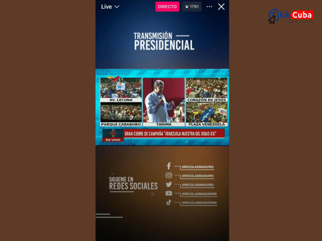 En la primera imagen, correspondiente al cierre de campaña del presidente Nicolás Maduro, se muestra una transmisión oficial organizada y estructurada con varias ubicaciones, incluyendo Av. Lecuña, Parque Carabobo y Plaza Venezuela. El evento, etiquetado como «Transmisión Presidencial», presenta diferentes segmentos. La pantalla dividida visualiza a los asistentes en puntos estratégicos para simular gran afluencia, lo que indica una logística bien planificada y un esfuerzo significativo del gobierno para aparentar apoyo. Sin embargo, la cantidad de espectadores en vivo, 1791 personas, sugiere una participación relativamente baja en comparación con el evento de la oposición. Además, la ausencia de comentarios en la transmisión puede limitar la interacción y la percepción de accesibilidad del evento.