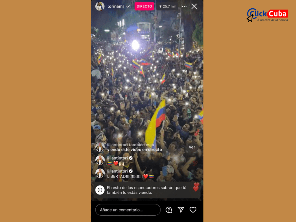 En contraste, la segunda imagen captura el cierre de campaña de María Corina Machado, candidata de la oposición, aunque quien se presenta es Edmundo González porque ella está inhabilitada por el régimen de Maduro. La transmisión, realizada a través de Instagram Live, muestra una multitud vibrante y enérgica, con banderas venezolanas y luces de teléfonos móviles, creando una atmósfera más espontánea y popular. La imagen refleja una participación masiva, con 25,7 mil de espectadores en vivo, lo cual es una cifra impresionante que denota un gran interés y apoyo hacia la candidata. La posibilidad de comentar en vivo y la presencia de figuras reconocidas como Lilian Tintori añaden un sentimiento de comunidad y respaldo, fomentando una mayor conexión entre los espectadores y la candidata.