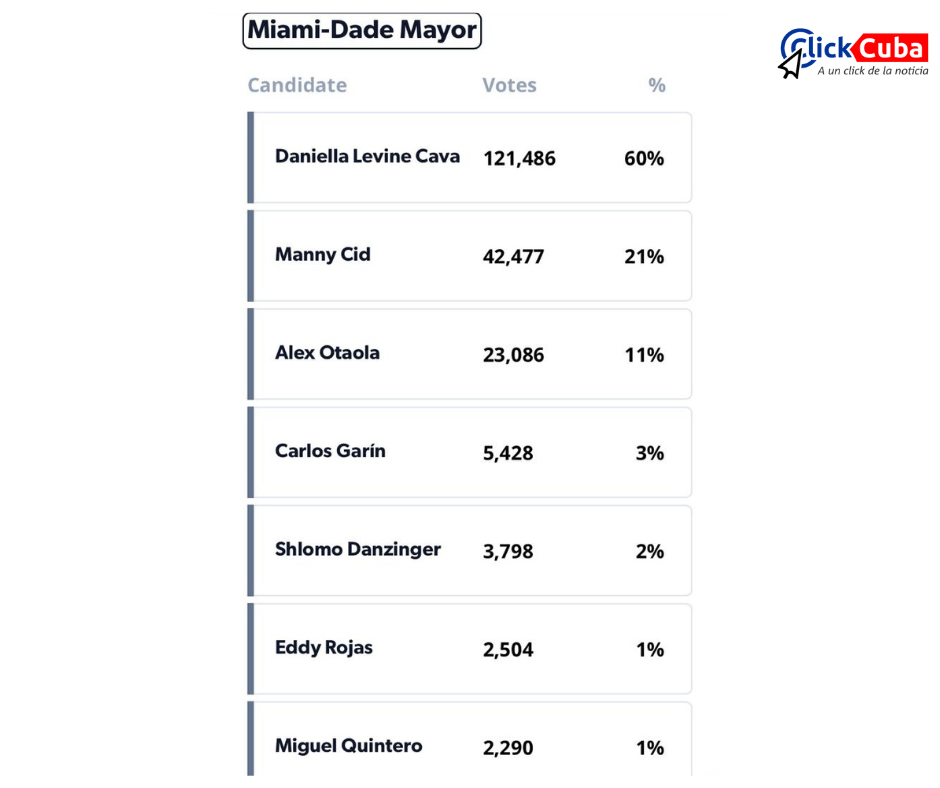 En las recientes elecciones para la alcaldía de Miami-Dade, la actual alcaldesa, Daniella Levine Cava , ha asegurado su reelección con una victoria contundente, obteniendo un 60% de los votos . Con 121,486 votos a su favor, Levine Cava ha demostrado un fuerte apoyo por parte de los votantes del condado.