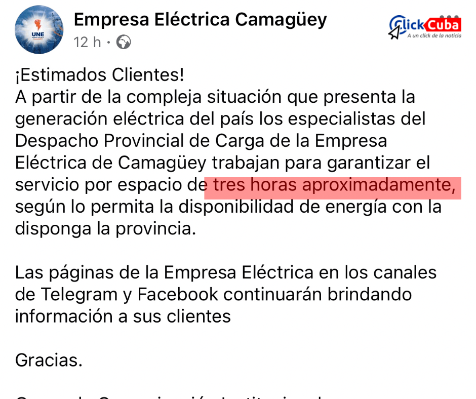 La Empresa Eléctrica de Camagüey comunicó a la población un drástico ajuste en el suministro de electricidad: los habitantes de la provincia solo contarán con aproximadamente tres horas diarias de servicio eléctrico. Según la empresa, esta medida se debe a la “compleja situación” que enfrenta la generación eléctrica del país y estará sujeta a la disponibilidad de energía en la provincia.