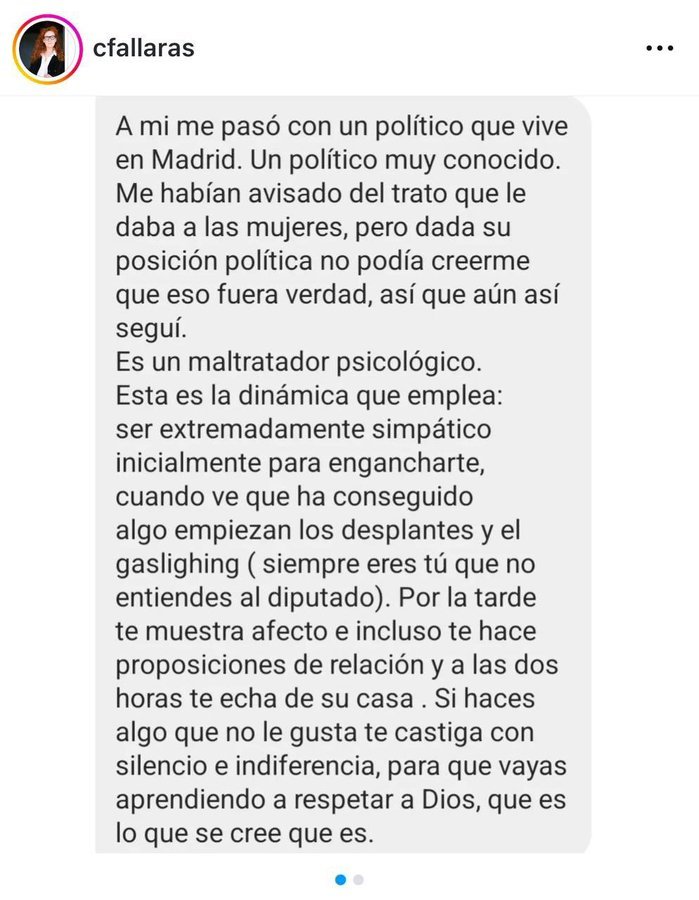 Diversas mujeres han presentado sus experiencias, coincidiendo en descripciones que califican al líder político de ser “manipulador, controlador y con comportamientos que han derivado en un claro abuso psicológico”. Aseguran que Errejón, quien se ha proyectado como un abandonado de la igualdad de género, mantuvo conductas que distan mucho de sus discursos públicos.