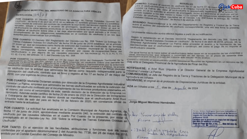 En un nuevo acto que refleja el autoritarismo del régimen cubano, el Ministerio de la Agricultura (Minagri) ha emitido la Resolución 164/2024, extinguiendo el contrato de usufructo que Ariel Ruiz Urquiola mantenía sobre una parcela en Viñales. La medida afecta directamente a su madre, Isabel Urquiola, de 77 años, quien reside en las tierras y cuya vida está dedicada al cuidado de animales y plantas. Sin embargo, lo más indignante es que tanto Ariel como su hermana Omara Ruiz Urquiola están fuera de Cuba debido a que la dictadura les prohíbe regresar a su propio país.