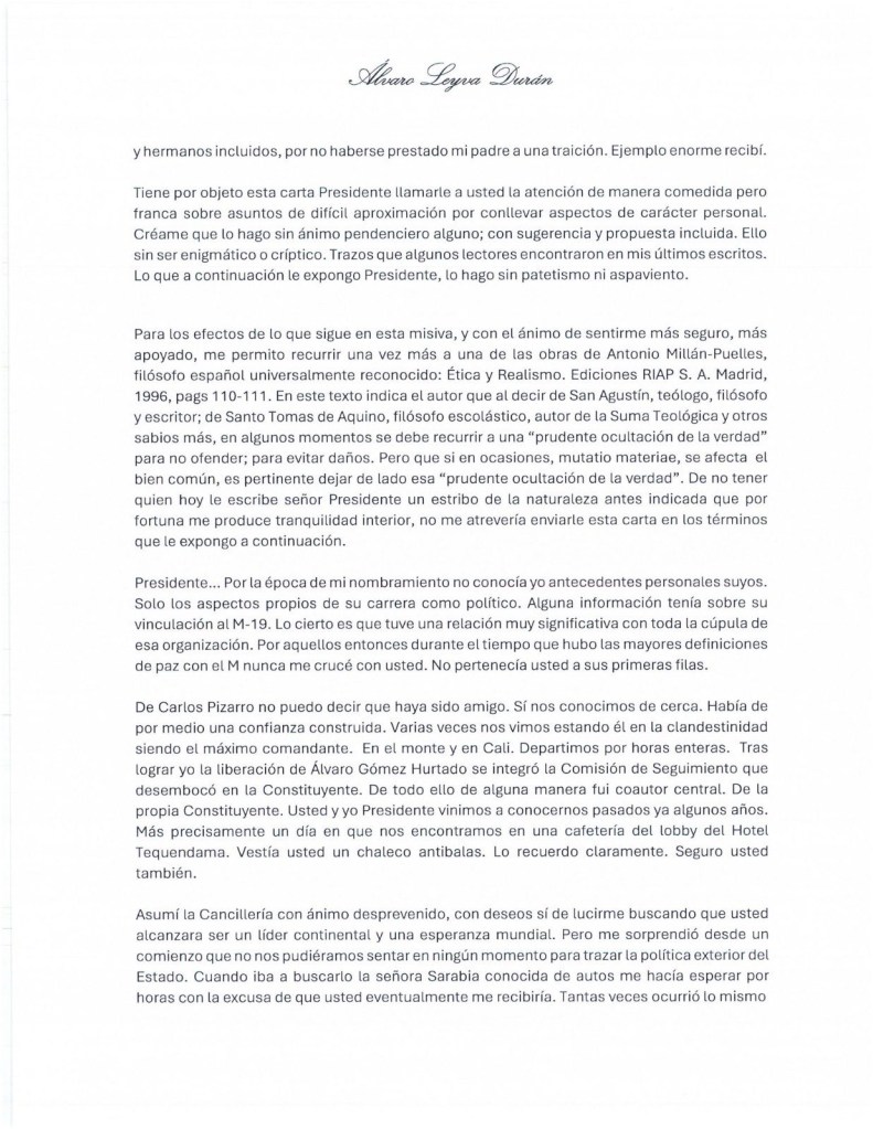 Leyva, quien fue una de las figuras clave de la política exterior de Petro, advierte en su carta que tomó la difícil decisión de dirigirse al mandatario luego de semanas de angustia personal por lo que califica como “hechos y situaciones que lo han afectado profundamente”, no solo como político, sino como ser humano. “Nunca fue fácil aproximarlo”, subraya, y revela que su voz fue ignorada incluso en los momentos más críticos de la diplomacia nacional.