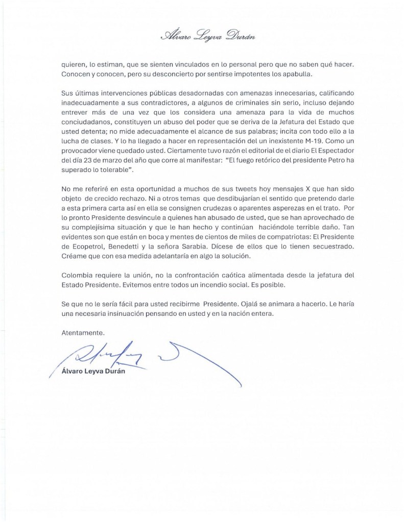 “Colombia requiere la unión, no la confrontación caótica alimentada desde la jefatura del Estado”, concluye Leyva, con un llamado a evitar un “incendio social”.
