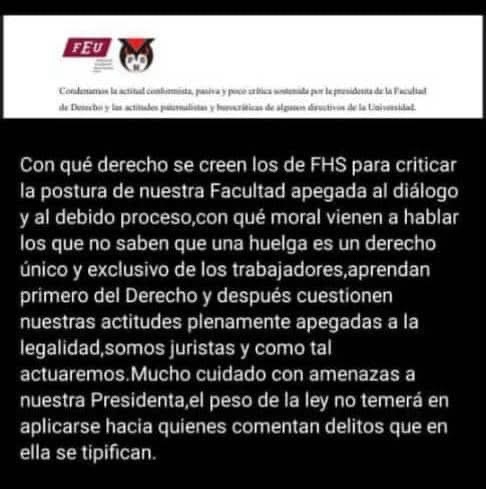 El mensaje de Almeyda surge como respuesta a una imagen que circula entre círculos oficialistas vinculados a la Facultad de Derecho de la Universidad de La Habana. En la misma, un texto plagado de intimidaciones y con un tono amenazante advierte que “una huelga es un derecho exclusivo de los trabajadores” y que cualquier amenaza contra la presidenta de la FEU “será tipificada como delito”. La publicación está acompañada por el logotipo de la FEU y el de la UJC.