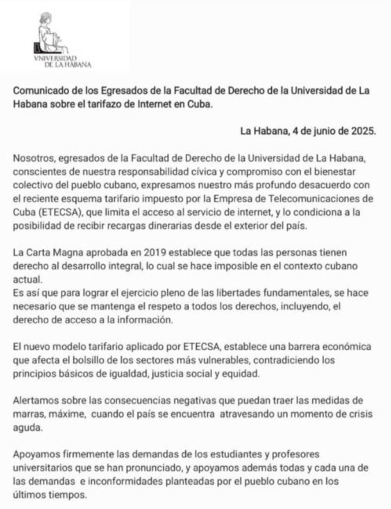 Por la justicia, la equidad y el derecho a la comunicación, así concluye el comunicado emitido por los egresados de la Facultad de Derecho de la Universidad de La Habana, una contundente respuesta al silencio de las autoridades académicas ante el reciente incremento de tarifas de internet impuesto por la Empresa de Telecomunicaciones de Cuba (ETECSA).