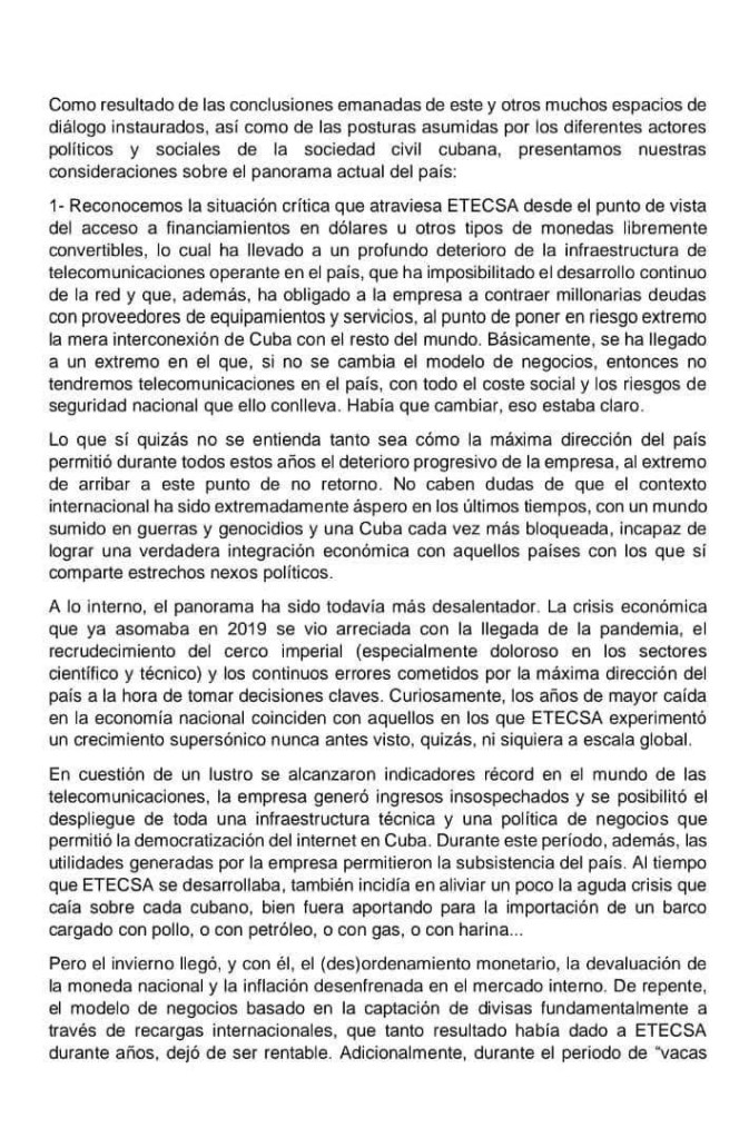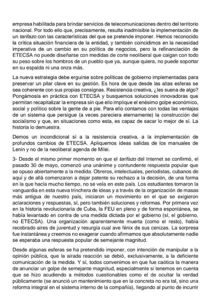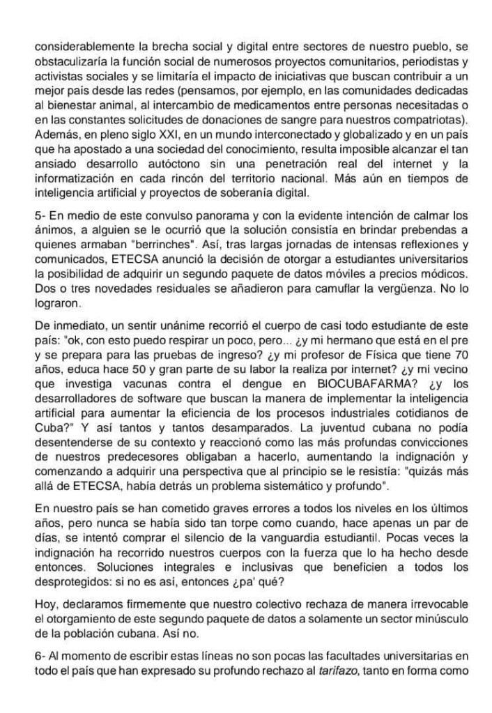 La carta detalla cómo, tras seis días de protesta, los altos dirigentes del país comenzaron a pronunciarse públicamente, aunque de forma limitada y sin responder con la seriedad que la situación amerita. Las medidas anunciadas por ETECSA para apaciguar los ánimos —como otorgar un segundo paquete de datos a estudiantes universitarios— fueron consideradas “residuales” y “vergonzosas”.