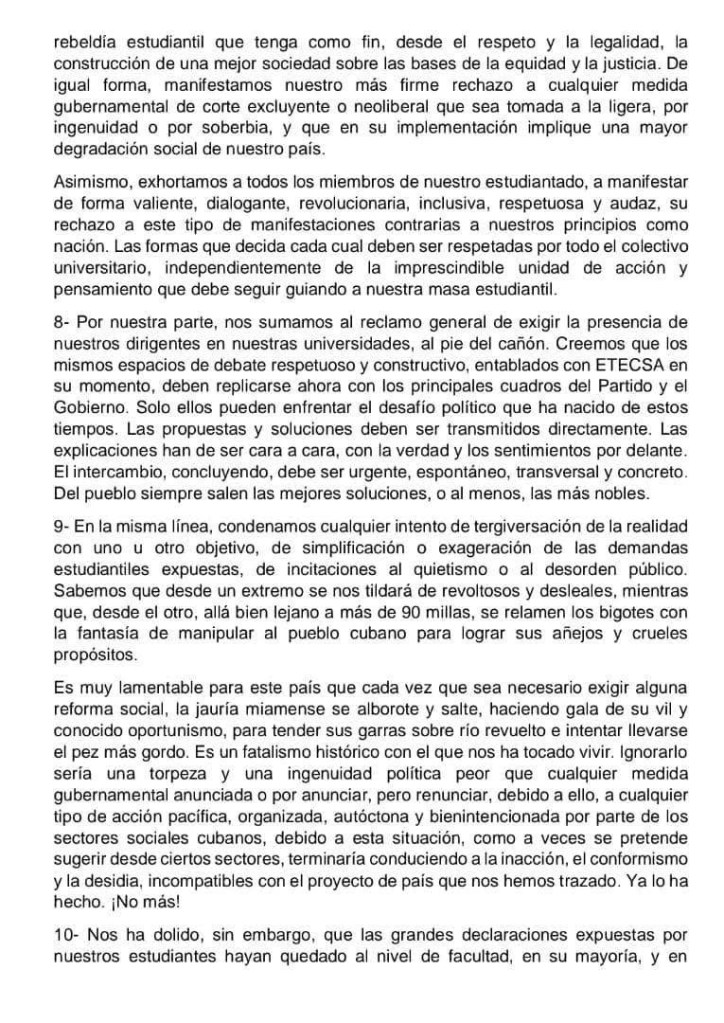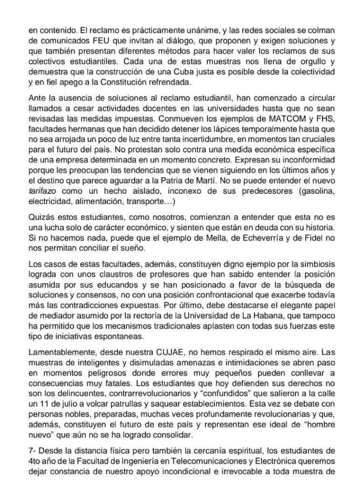 Los estudiantes alertan sobre intentos de manipulación del relato oficial y denuncian amenazas y amedrentamientos dentro de la CUJAE. Rechazan categóricamente los intentos de presentar la protesta como un acto desestabilizador o promovido desde el extranjero. También condenan los intentos de simplificar la protesta a una “rabieta estudiantil”, recordando que detrás hay un descontento profundo con años de promesas incumplidas, pobreza digital y exclusión.