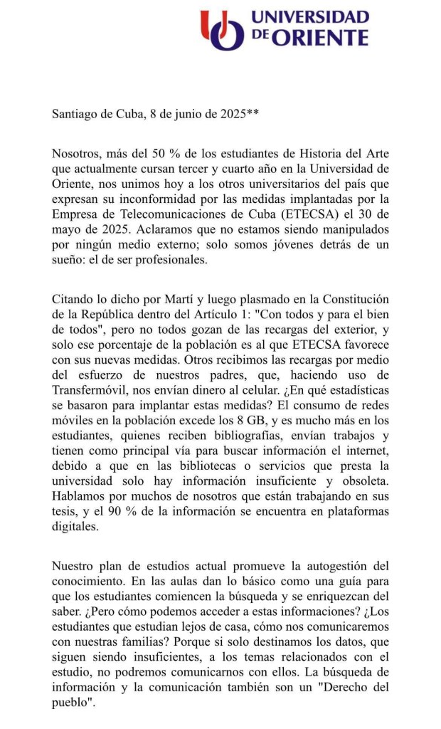 Más del 50 % de los estudiantes de tercer y cuarto año de la carrera de Historia del Arte en la Universidad de Oriente han hecho pública su adhesión al creciente movimiento estudiantil contra las nuevas tarifas impuestas por la Empresa de Telecomunicaciones de Cuba (ETECSA). En una contundente declaración fechada este 8 de junio, los alumnos denunciaron que las medidas aplicadas desde el 30 de mayo son excluyentes y representan un atropello a su derecho a la comunicación y al acceso al conocimiento.