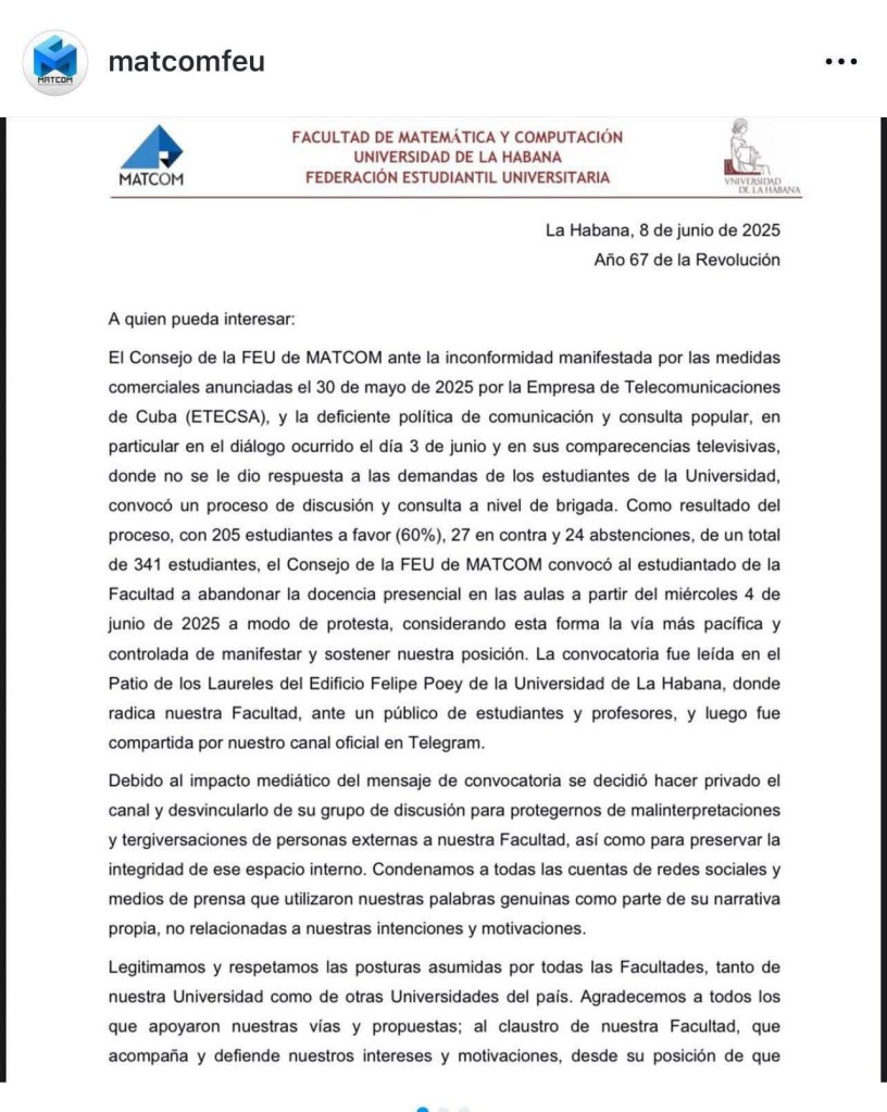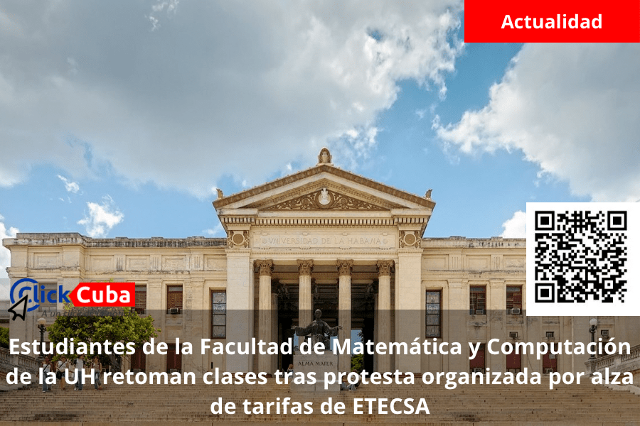 El Consejo de la Federación Estudiantil Universitaria (FEU) de la Facultad de Matemática y Computación (MATCOM) de la Universidad de La Habana ha anunciado el fin de la suspensión de clases presenciales iniciada como forma de protesta contra las nuevas tarifas impuestas por ETECSA. Esta decisión llega tras una votación interna en la que el 60% del estudiantado respaldó la medida temporal como expresión de inconformidad.