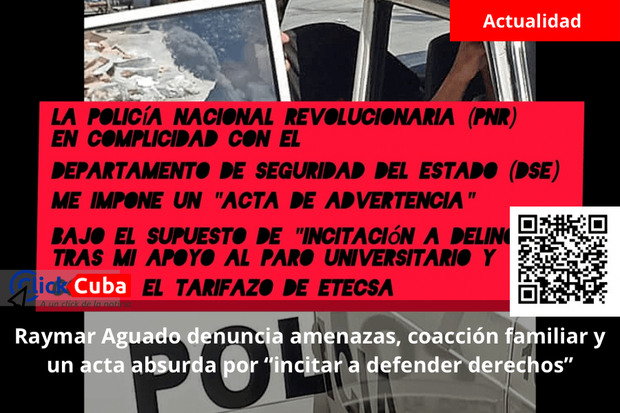 El estudiante universitario Raymar Aguado Hernández relató con detalle cómo fue intimidado, insultado y amenazado por oficiales de la Seguridad del Estado y la Policía Nacional Revolucionaria (PNR) por apoyar el paro universitario contra el tarifazo de ETECSA. La represión incluyó una “Acta de Advertencia” por promover que los jóvenes defiendan sus derechos