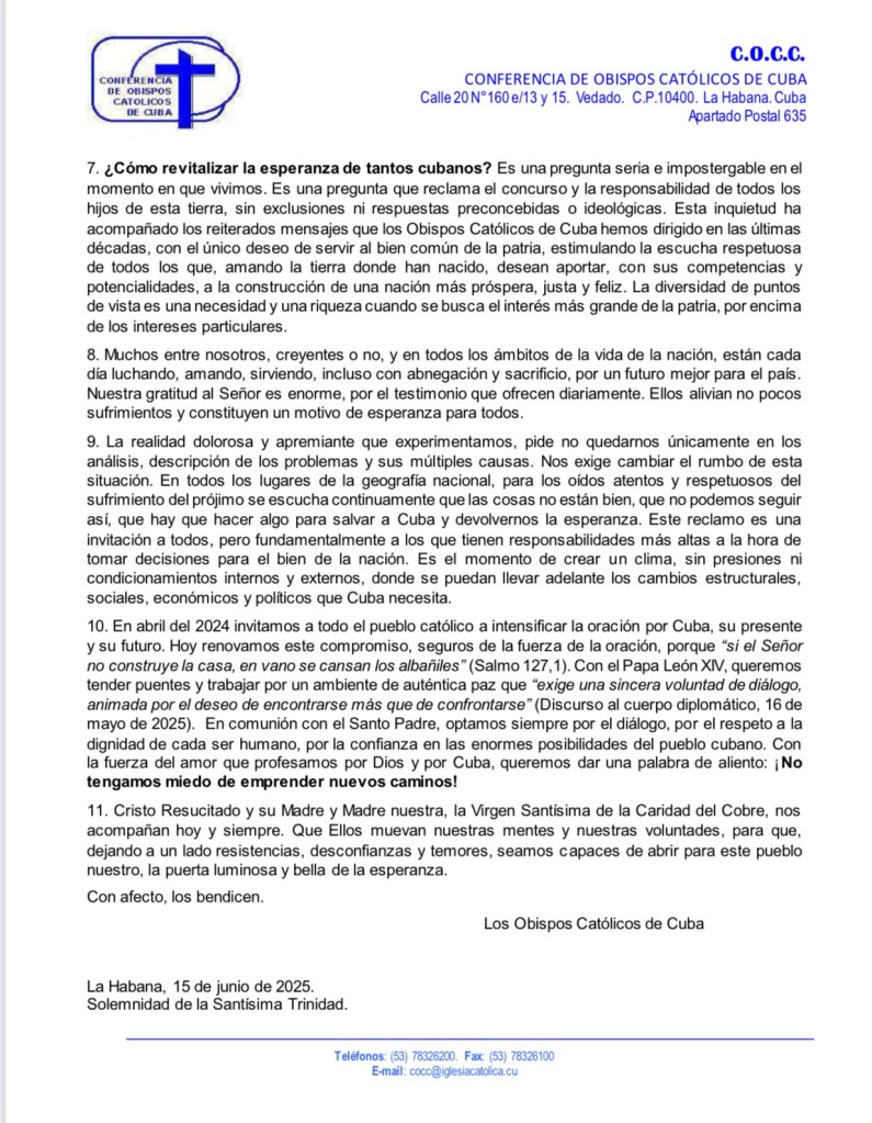 Finalmente, invitan a toda la población católica a prepararse espiritualmente para el Año Santo del 2025, propuesto por el Papa, y que tendrá como centro el Jubileo en Roma bajo el lema “Peregrinos de Esperanza”. En Cuba, aseguran, se vivirá de forma especial, con celebraciones, oraciones y encuentros de reflexión.
