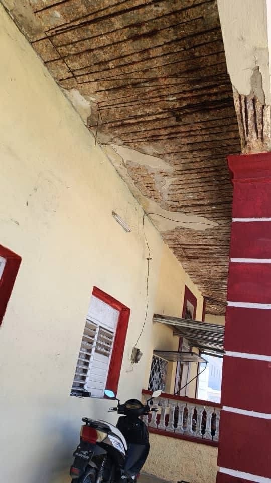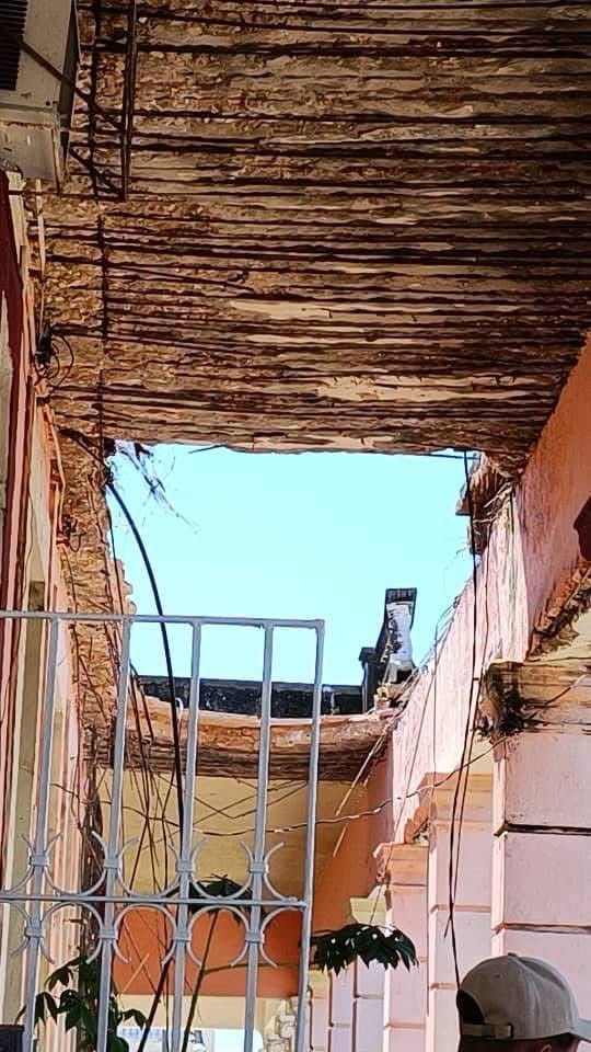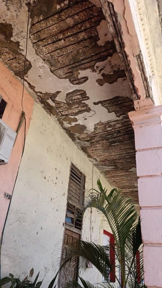 Vecinos de un edificio patrimonial en Colón, Matanzas, viven bajo amenaza constante. El techo de la vivienda muestra severos daños estructurales: desprendimientos de concreto, hierro expuesto, y secciones colapsadas, como evidencian las imágenes recientes compartidas por residentes locales.