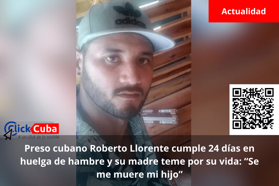 El preso cubano Roberto Llorente Martínez cumple hoy 24 días en huelga de hambre en el Combinado del Este, sin haber recibido atención médica adecuada ni respuesta oficial a sus denuncias sobre irregularidades judiciales. Su madre, angustiada, ha declarado que teme por su vida: “Se me muere mi hijo”.