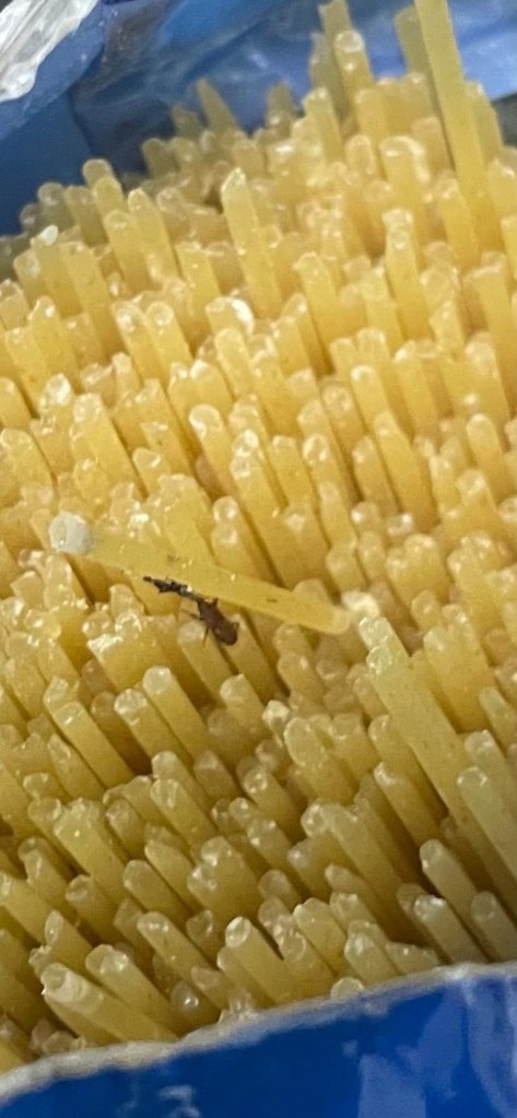 En las fotografías se observan varios insectos adheridos a los espaguetis dentro del envase sellado, lo que sugiere que la contaminación ocurrió durante el proceso de almacenamiento o empaque. El denunciante cuestionó la ausencia de control sanitario y la complicidad de los inspectores estatales, a quienes acusó de concentrarse únicamente en multar a los ciudadanos de bajos recursos mientras ignoran violaciones graves a la salud pública.