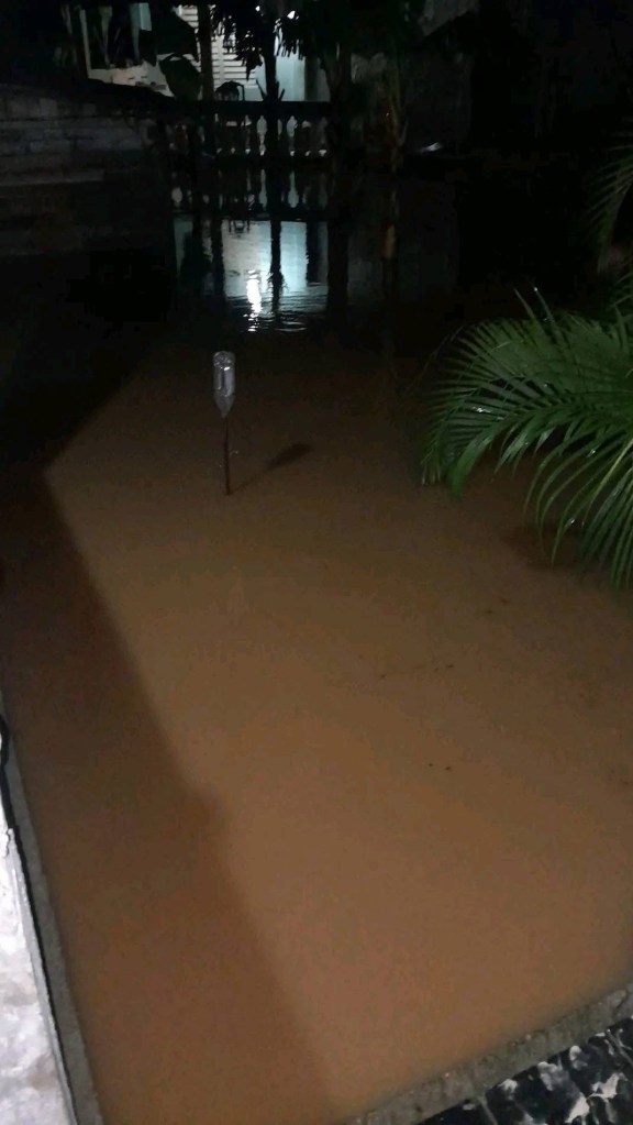 En una de las imágenes se ve a una mujer moviéndose a tientas dentro de su propia casa, intentando salvar lo poco que puede mientras el agua turbia le llega casi a la cintura. Afuera, el panorama no es mejor: los caminos están completamente cubiertos y el nivel del agua continúa subiendo durante la noche, lo que mantiene a las familias en alerta permanente.