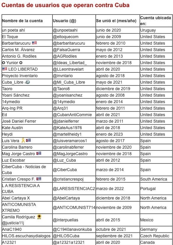Según el análisis —publicado el 26 de noviembre de 2025—, las cuentas incluidas en ese listado mostrarían patrones similares: creación reciente, actividad intensa en horarios pico, repetición de narrativas anticastristas, uso de imágenes de violencia, emigración, represión, y una marcada intención de movilización ciudadana en contra del gobierno.