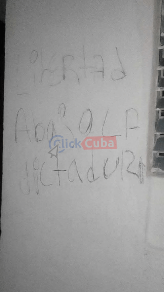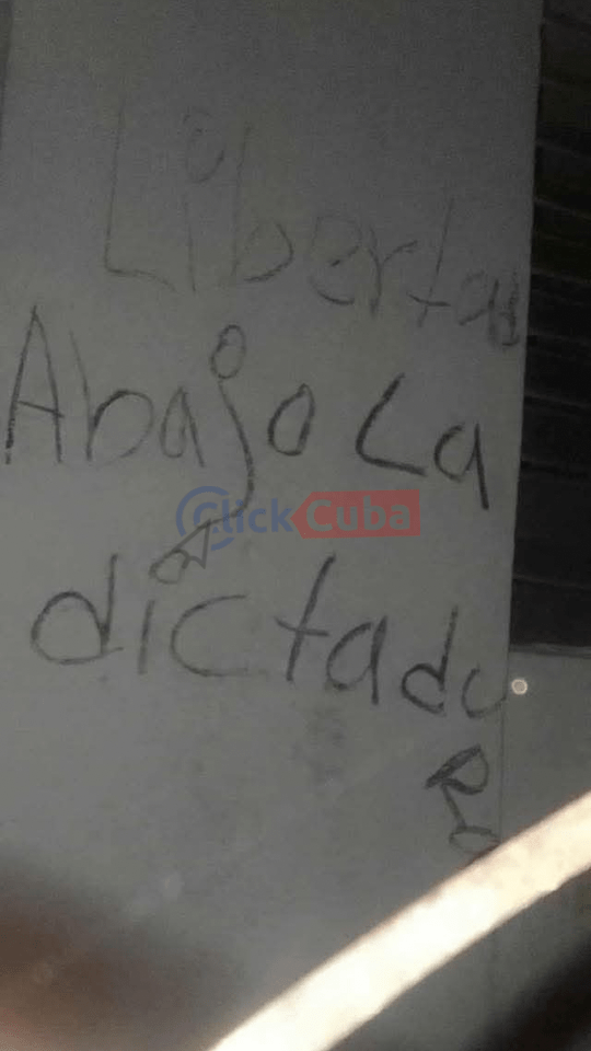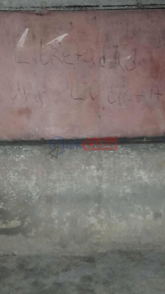 Las imágenes enviadas a ClickCuba muestran frases como “Libertad”, “Abajo la dictadura” y “Abajo Canel, tenemos hambre”, escritos sobre paredes, columnas y hojas de papel sujetas a cercas improvisadas. Trazos rápidos, letras grandes, materiales precarios: todo indica una acción realizada en la oscuridad y con extrema cautela, en un país donde escribir una frase de protesta puede costar prisión.
