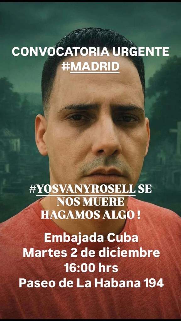 La comunidad cubana en el exilio lanzó este lunes un llamado urgente a todos los cubanos dentro y fuera de la isla, así como a aliados internacionales, para movilizarse mañana 2 de diciembre frente a embajadas y representaciones oficiales del régimen en todo el mundo. El objetivo: exigir fe de vida, atención médica adecuada y una solución inmediata para el preso político Yosvany Rosell García Caso, quien cumple 40 días en huelga de hambre y se encuentra al borde del colapso total.