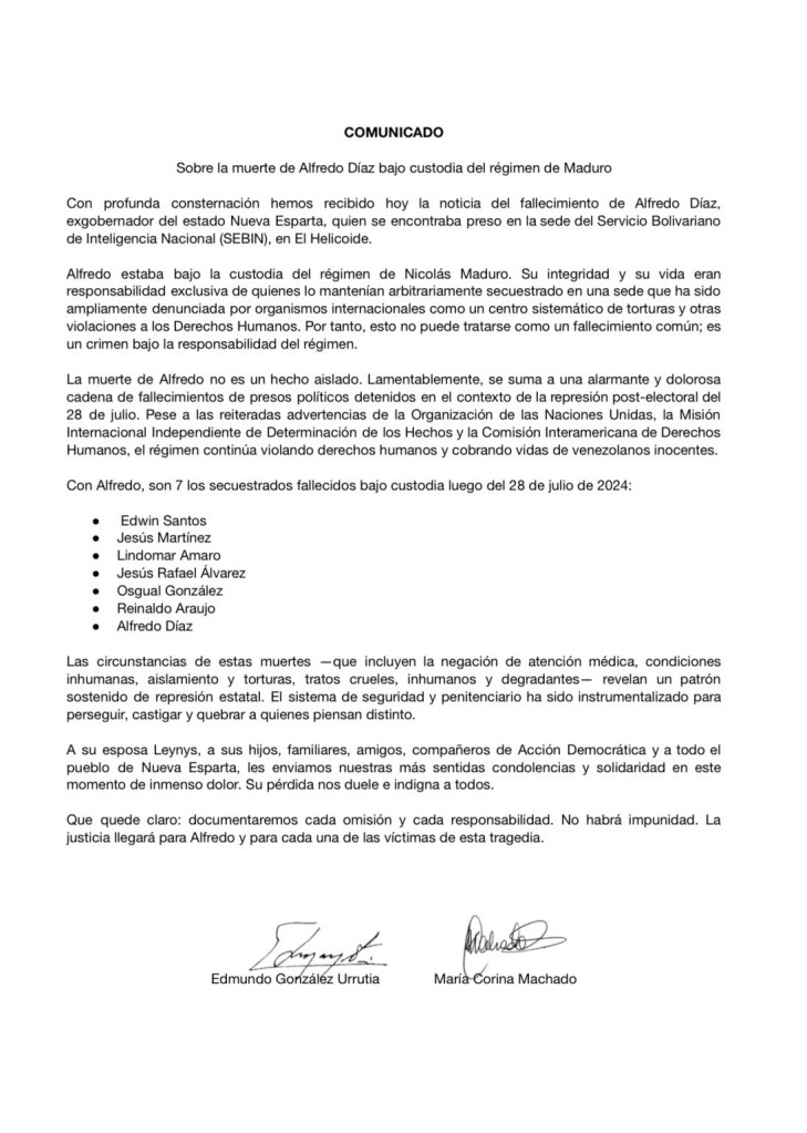 Díaz permanecía recluido desde la represión post-electoral del 28 de julio, acusado y aislado sin garantías procesales. Su muerte se suma a una creciente lista de presos políticos fallecidos bajo custodia estatal. Según el documento, ya son siete los detenidos que han perdido la vida en ese contexto: