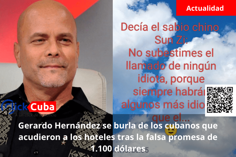 El ex espía cubano Gerardo Hernández, actual dirigente del oficialismo, reaccionó públicamente a la estampida de ciudadanos que acudieron este 6 de diciembre a hoteles de varias provincias tras la falsa promesa de Ignacio Jiménez, quien aseguró que se entregarían 1.100 dólares en efectivo a cada persona registrada. La publicación de Hernández en Facebook deja clara su visión sobre quienes creyeron el rumor: los considera ingenuos, manipulables y, en esencia, objeto de burla.