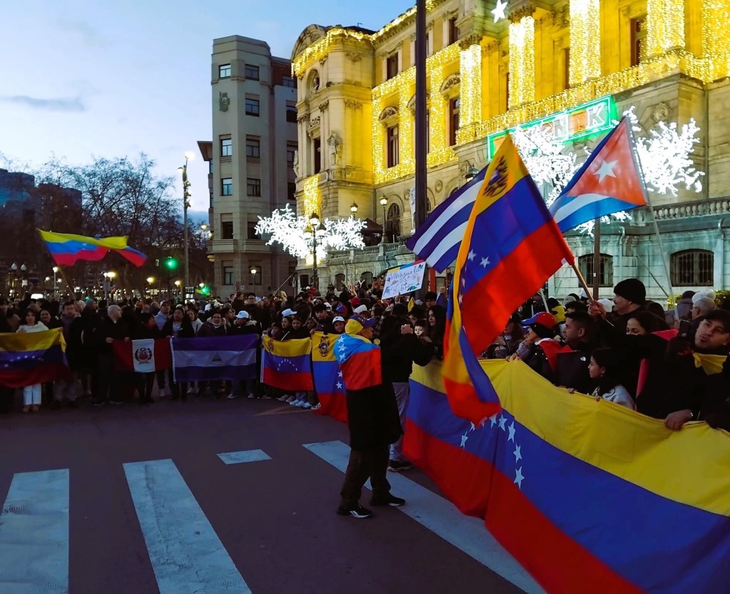 Frente al Ayuntamiento de Bilbao se celebró ayer una manifestación en apoyo al pueblo venezolano, en un ambiente de alegría, emoción y celebración cívica, especialmente entre la comunidad venezolana residente en Euskadi. La convocatoria estuvo marcada por la reacción a la captura de Nicolás Maduro, un hecho que los asistentes calificaron como histórico y decisivo para el futuro democrático de Venezuela.