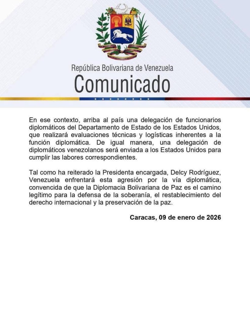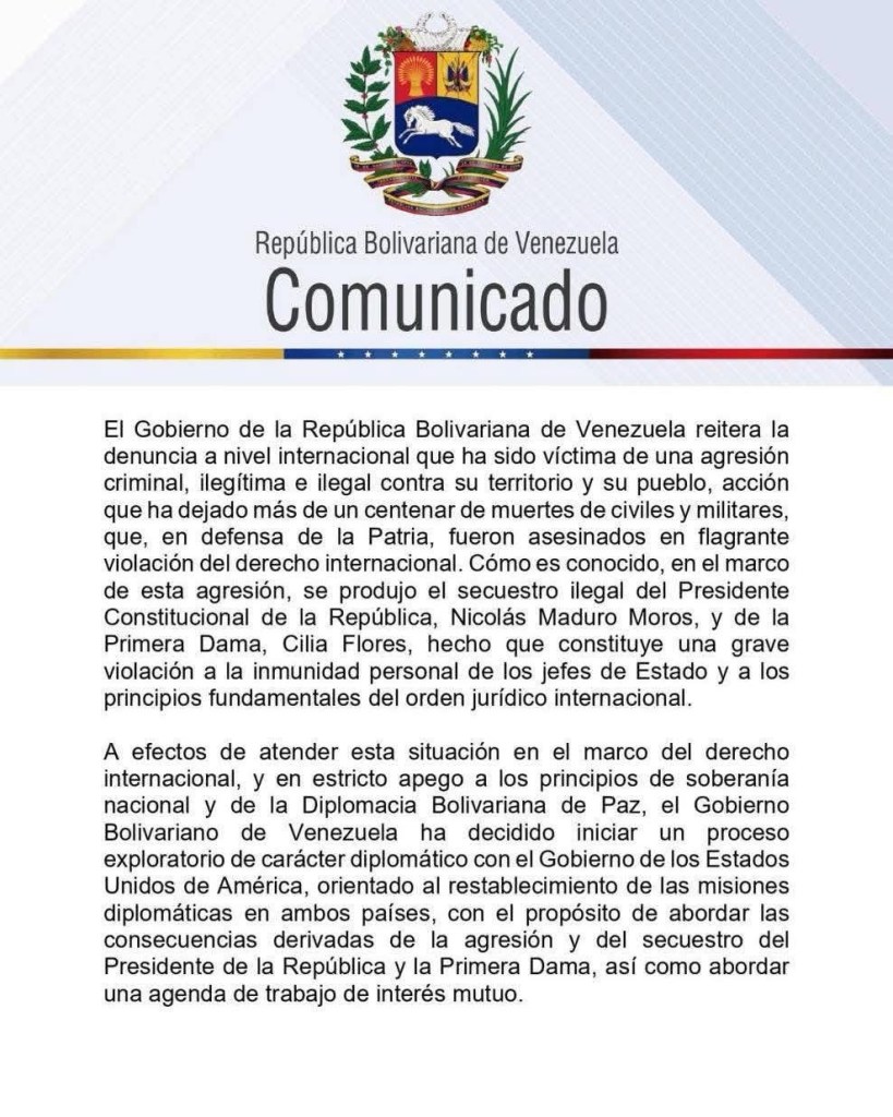Pese a la denuncia y a las acusaciones de agresión, el comunicado anuncia un giro estratégico orientado a la vía diplomática. Según el texto, el Ejecutivo venezolano decidió “iniciar un proceso exploratorio de carácter diplomático con el Gobierno de los Estados Unidos de América”, cuyo objetivo sería el restablecimiento de relaciones diplomáticas y el abordaje de las consecuencias derivadas de la captura de Maduro y Flores.