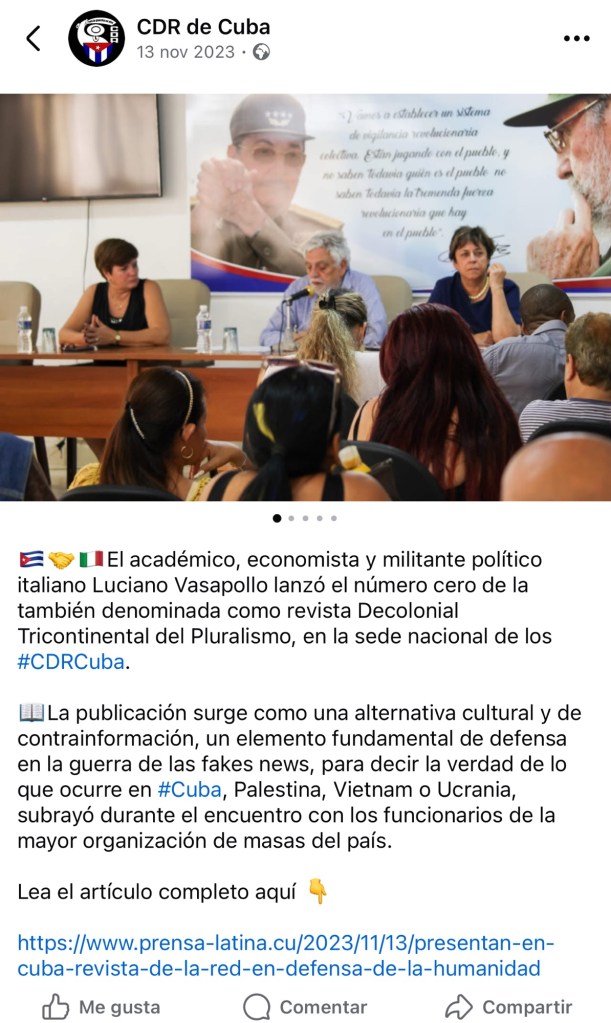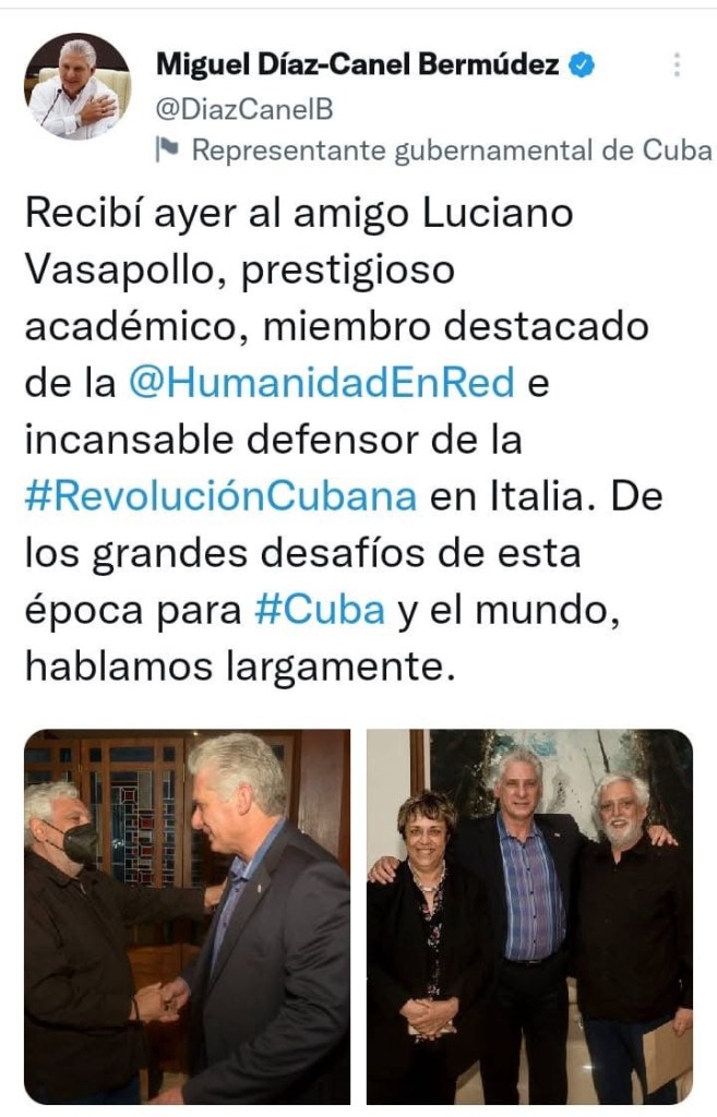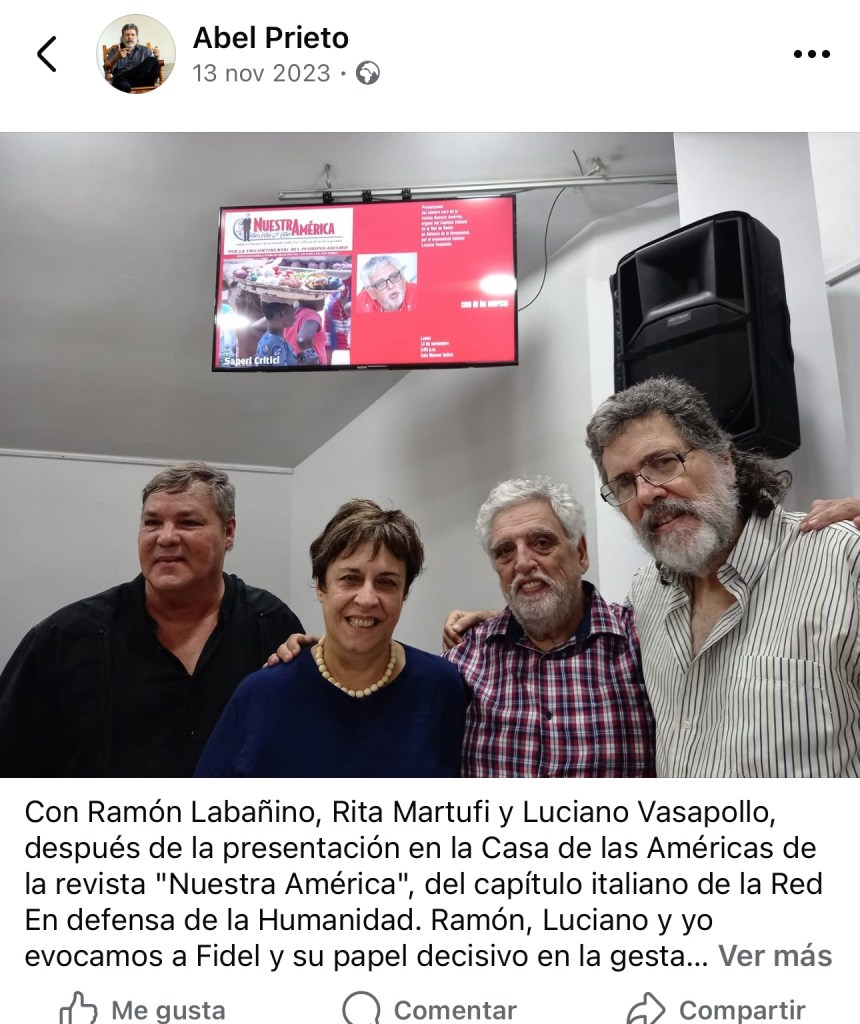 Luciano Vasapollo es profesor universitario, economista marxista y miembro activo de redes de apoyo internacional a La Habana y Caracas. Su trayectoria incluye: participación en la Red de Intelectuales en Defensa de la Humanidad, presentaciones oficiales en instituciones del régimen cubano como Casa de las Américas y los CDR, reuniones diplomáticas y públicas con Miguel Díaz-Canel en La Habana, apariciones en medios estatales venezolanos como Venezolana de Televisión (VTV), actos y fotos junto al hoy detenido expresidente Nicolás Maduro.