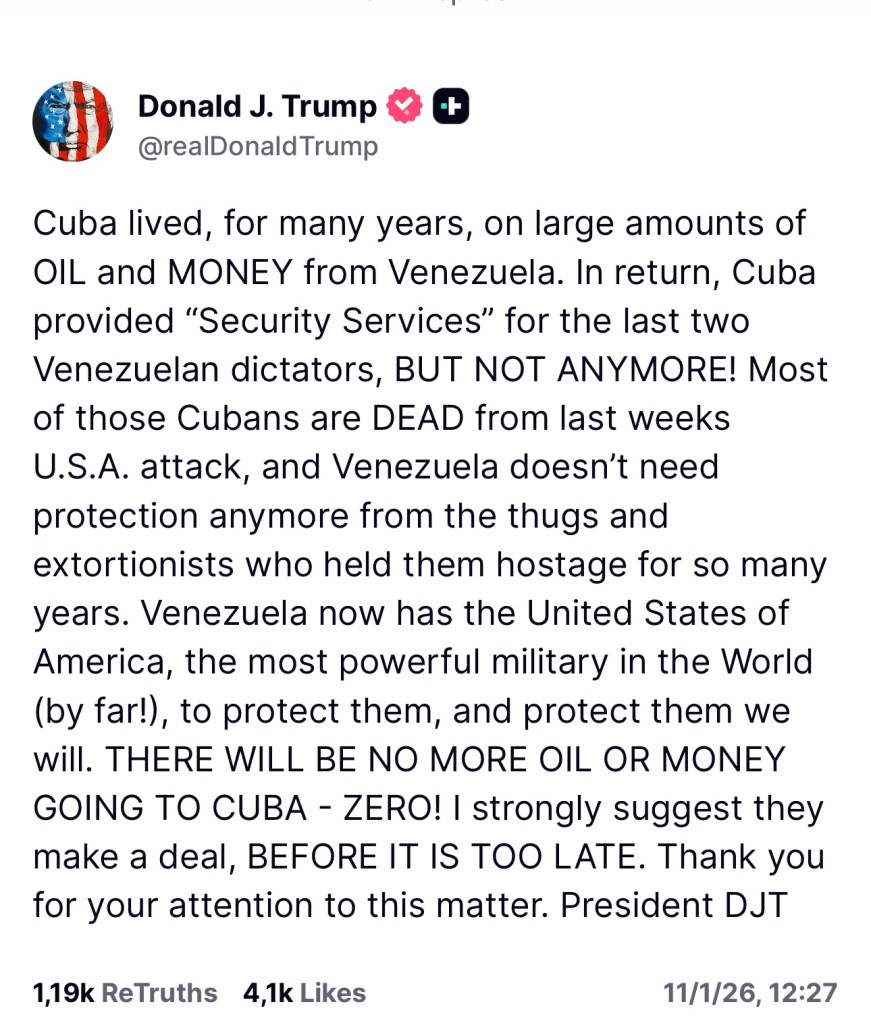 En el texto, Trump sostiene que “Cuba vivió durante muchos años de grandes cantidades de petróleo y dinero de Venezuela”, señalando que, a cambio, la isla habría ofrecido “servicios de seguridad” a los últimos dos gobiernos venezolanos. Esa cooperación, según el mandatario, ya no existe: “PERO YA NO MÁS”, escribió en mayúsculas.