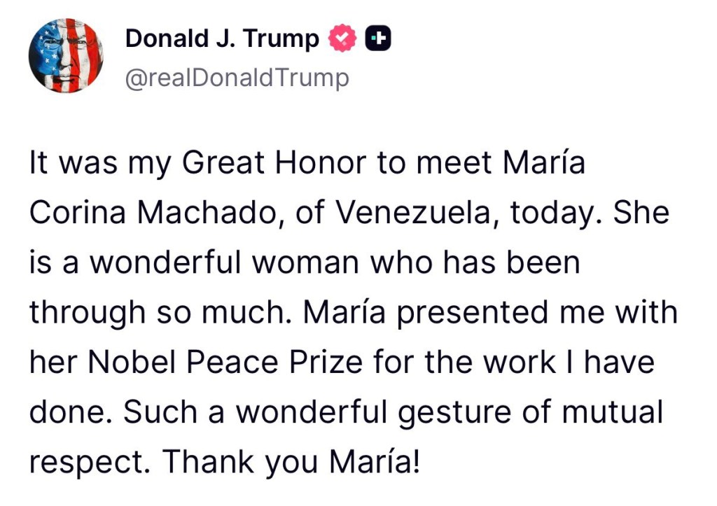 En una publicación en su red social, Trump calificó el encuentro como “un gran honor” y elogió a Machado como “una mujer maravillosa que ha pasado por tanto”. Según su mensaje, la líder venezolana le entregó un reconocimiento simbólico, su “Premio Nobel de la Paz”, en agradecimiento “por el trabajo que he realizado”. Trump definió el gesto como una muestra de “respeto mutuo” y agradeció públicamente a Machado.