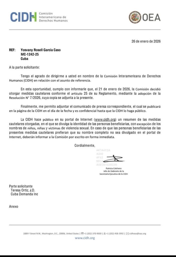 De acuerdo con la comunicación oficial firmada por Patricia Colchero, Jefa de Gabinete de la Secretaría Ejecutiva de la CIDH, la Comisión resolvió aplicar medidas conforme al artículo 25 de su Reglamento, tras evaluar los elementos presentados y concluir que el Estado cubano debe actuar para proteger la vida e integridad del beneficiario.