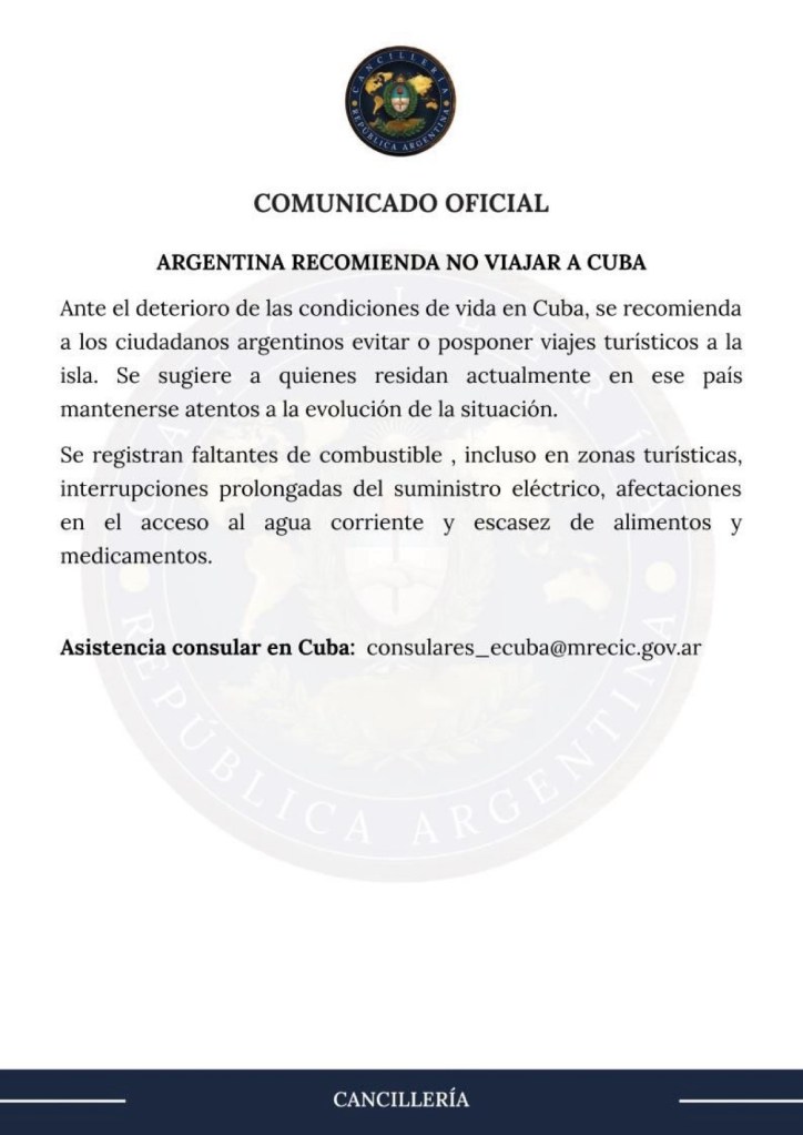 La Cancillería de Argentina emitió un comunicado oficial en el que recomienda a sus ciudadanos evitar o posponer viajes turísticos a Cuba debido al deterioro de las condiciones de vida y de los servicios básicos en el país caribeño. La advertencia incluye también un llamado a los argentinos que ya se encuentran en territorio cubano para que se mantengan atentos a la evolución de la situación.