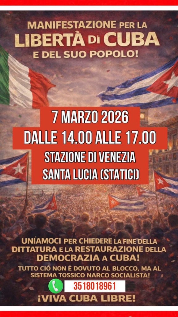 Ese mismo día, en Venecia, Italia, se desarrollará otra concentración entre las 14:00 y las 17:00 horas frente a la estación Santa Lucia. El llamado, divulgado en italiano y español, invita a unirse para reclamar el fin de la dictadura y la restauración de la democracia en Cuba.