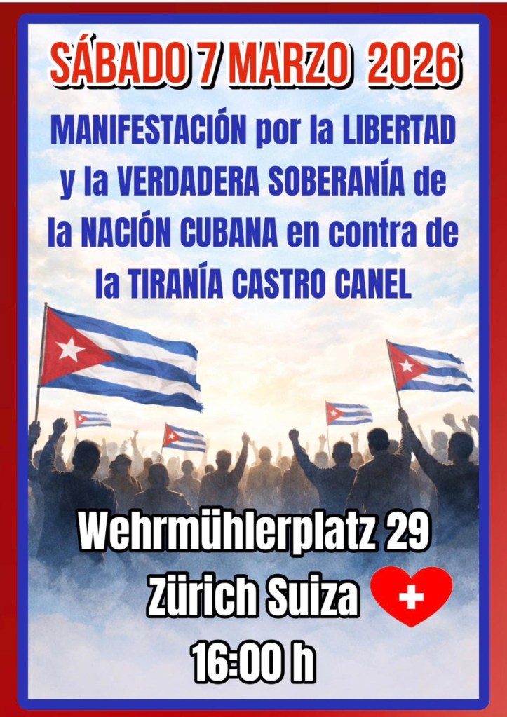 En Zúrich, Suiza, la manifestación está prevista para las 16:00 horas en Wehrmühlerplatz 29. La convocatoria, difundida en redes sociales, llama a exigir “la verdadera soberanía de la nación cubana” y a denunciar la permanencia del actual sistema político en el poder.