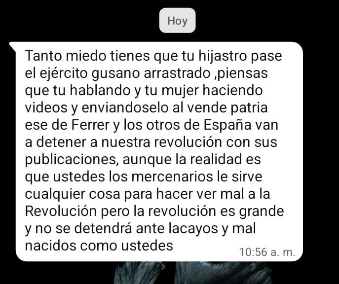 En un mensaje enviado al teléfono del joven, el interlocutor utiliza un lenguaje agresivo y despectivo, calificando a la familia de “mercenarios” y “gusanos”, términos frecuentemente empleados por simpatizantes del régimen cubano para atacar a opositores o periodistas independientes.