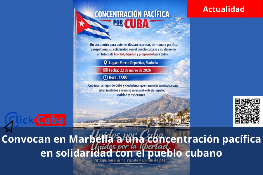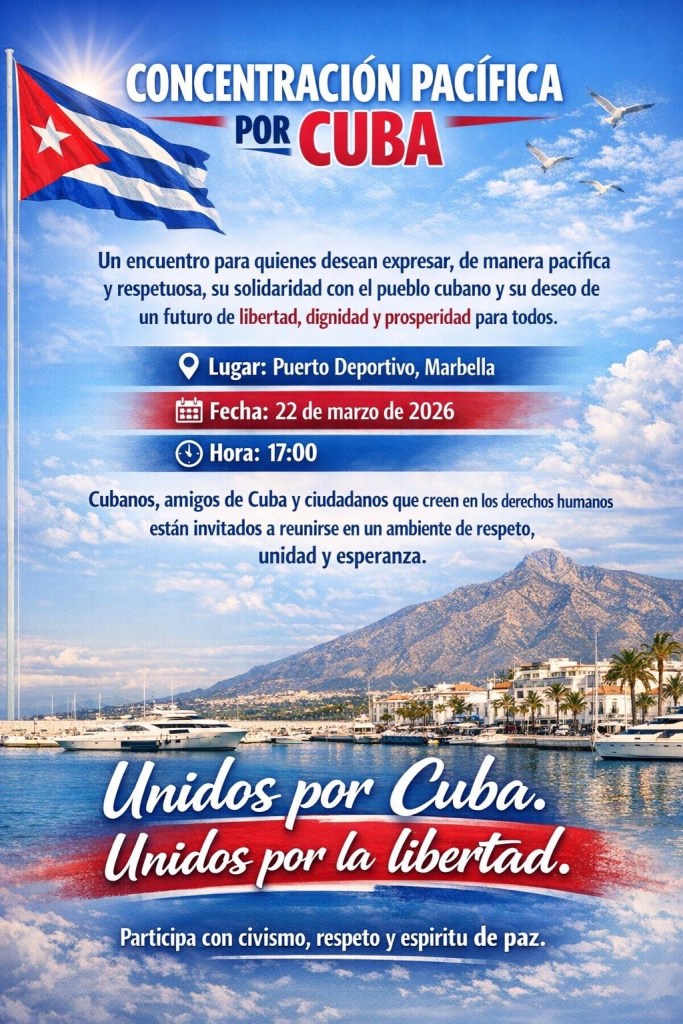 El próximo 22 de marzo de 2026, cubanos residentes en España, junto a amigos de la causa democrática y ciudadanos comprometidos con los derechos humanos, han sido convocados a participar en una concentración pacífica en solidaridad con el pueblo cubano. El encuentro tendrá lugar a las 17:00 horas en el Puerto Deportivo de Marbella, en la provincia de Málaga.