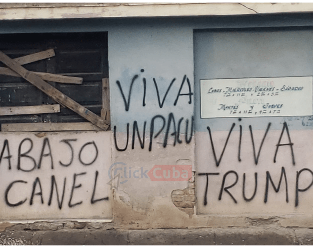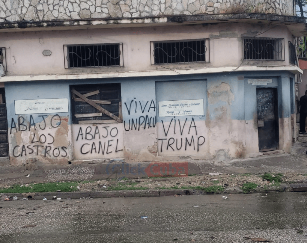 Entre las frases que se pueden leer en el lugar aparecen “Abajo los Castros”, “Abajo Canel”, “Viva UNPACU” y “Viva Trump”, mensajes que ocupan gran parte de la fachada del local y que han comenzado a circular ampliamente en redes sociales y aplicaciones de mensajería.