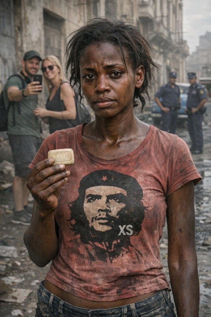 Ninguno de esos pijos-zurdos ha hecho una cola pa´comprar un pedacito de mortadela, ni ha cargado cubos de agua pa´ bañarse, y mucho menos ha comido picadillo de soya, pasta de oca, ni se han lavado los dientes con pasta Perla. De hecho, nunca encendieron un mechón ni un quinqué. No saben lo que es un apagón, ni lo que significa tener tu derecho de protesta anulado, so pena de muerte. Solo son fanáticos que van a visitar un parque temático y a llevarse el recuerdo de una foto con alguna negrita famélica que finge ser feliz mientras muestra su pulóver del Che Guevara talla XS, producto de la falta de jama y la precariedad; una mujer que seguramente se zumbarán, a cambio de unas monedas, y de una pastilla de jabón usada, para luego decir que tuvieron una interacción con la población cubana.