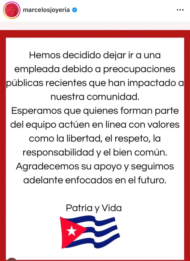 La publicación de Marcelo’s Jewelry se enmarca en la reacción de sectores del exilio cubano ante este tipo de casos. En su comunicado, la empresa también subraya que no responsabiliza a individuos por las creencias de sus familiares, pero establece criterios internos sobre la coherencia con los valores que defiende.