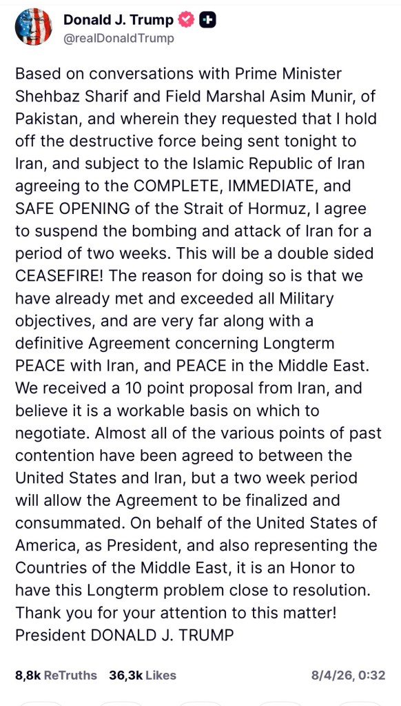El presidente de Estados Unidos, Donald J. Trump, anunció la suspensión temporal de acciones militares contra Irán durante un período de dos semanas, en lo que calificó como un “alto el fuego bilateral” en desarrollo.