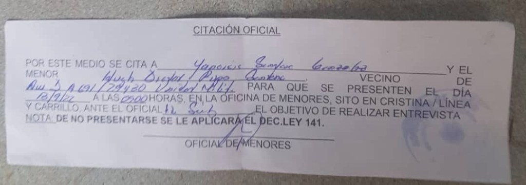 Su hijo, Hugh Dieter Pupo Santana, fue citado oficialmente por autoridades cuando aún era menor de edad, como se aprecia en una citación emitida por la oficina de menores. A ello se suman documentos clínicos que reflejan el seguimiento psicológico al que fue sometido, donde se registran síntomas de ansiedad, depresión, trastornos del sueño y afectaciones emocionales asociadas a la prisión de su padre tras las protestas del 11 de julio de 2021.